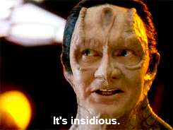 But that’s what the episode was about, how the constitution, or in the instance of Star Trek —obeying Starfleet regulations — don’t mean all that much at the breaking point. Not if you’re looking at a losing war with the superior forces of the dominion, and facing down the complete takeover of the Alpha quadrant and death of everyone and everything you love by the shapeshifting Founders and Jem’Hadar soldiers (who are literally bred for war and fed on Ketracel-white to keep them belligerent, besides their subservience to their masters who provide it.)